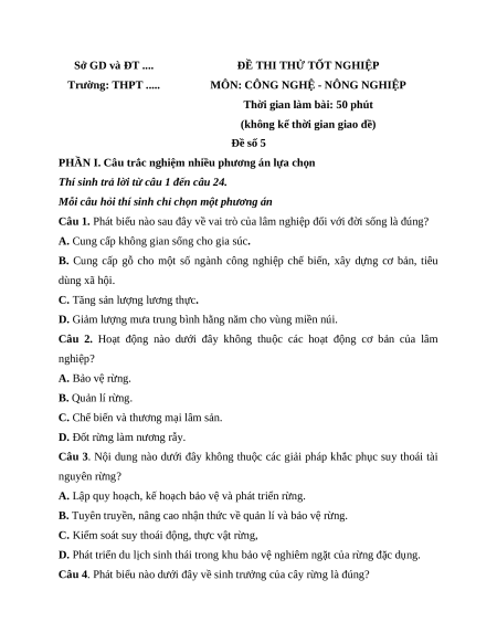 Đề ôn thi Tốt nghiệp Công nghệ (Định hướng Nông nghiệp) - Đề 5