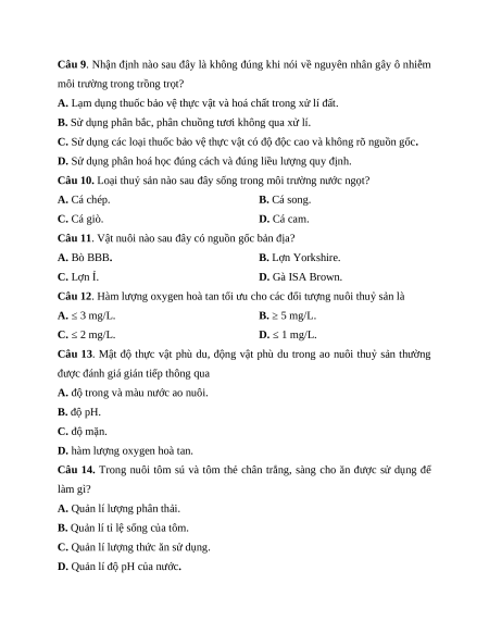 Câu 12. Hàm lượng oxygen hoà tan tối ưu cho các đối tượng nuôi thuỷ sản là A. ≤ 3 mg/L. B. ≥ 5 mg/L. C. ≤ 2 mg/L. D. ≤ 1 mg/L.