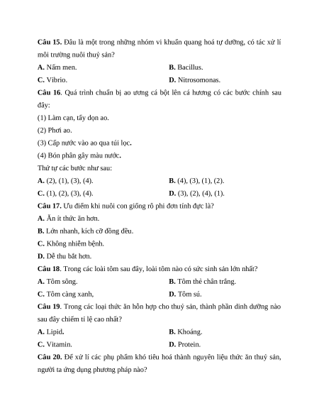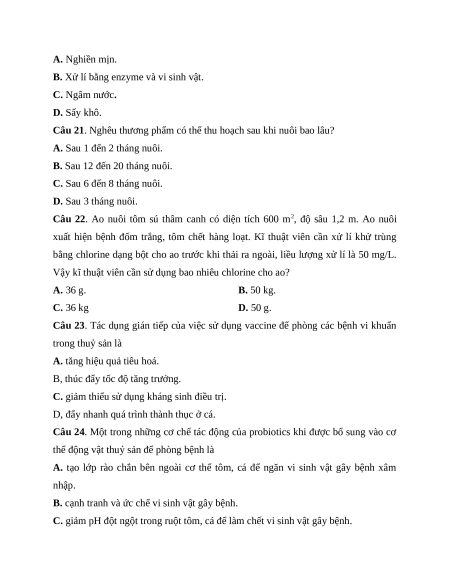 Câu 20. Để xử lí các phụ phẩm khó tiêu hoá thành nguyên liệu thức ăn thuỷ sản,