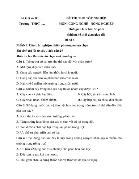 Đề ôn thi Tốt nghiệp Công nghệ (Định hướng Nông nghiệp) - Đề 8
