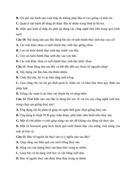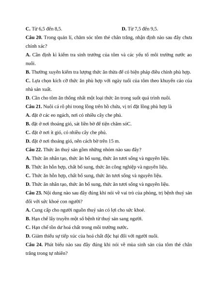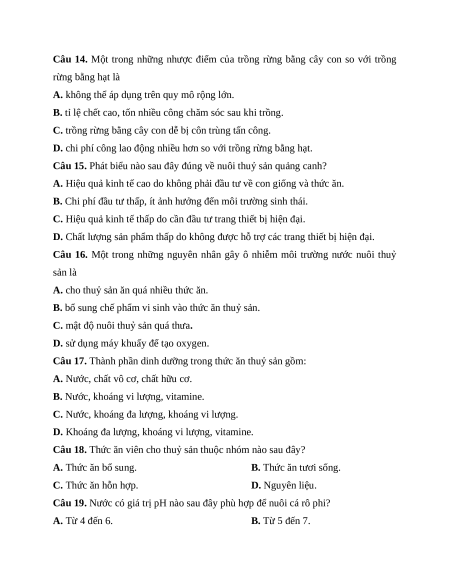 Câu 19. Nước có giá trị pH nào sau đây phù hợp để nuôi cá rô phi? A. Từ 4 đến 6. B. Từ 5 đến 7.
