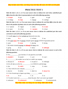 differs from the other three in pronunciation in each of the following questions. 1. A. brush B. put C. push D. pull 2. A. looked B. tried C. stopped D. watched