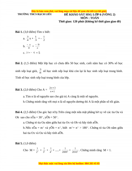 Đề thi chọn HSG cấp Trường môn Toán 6 năm 2022 - 2023 - THCS Bạch Liêu có đáp án