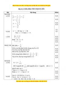 đáp án và biểu điểm-THCS BẠCH LIÊU Bài Nội dung Điểm Bài1(3đ) a.(1đ) x = - - = - 0.25 x = - : 0.25 x = - . 0.25 0.25 x = - 0.5 b.(1đ) -x = - 36 hay x = 36 0.5 Vậy x = 6 hoặc x = - 6 c.(1đ) 2x - 1 = 5 0.25 x = 3 0.25 Hoặc 2x - 1 = -5 0.25 x = - 2 0.25 Bài2(1.5đ) Đổi 30% = 0.25