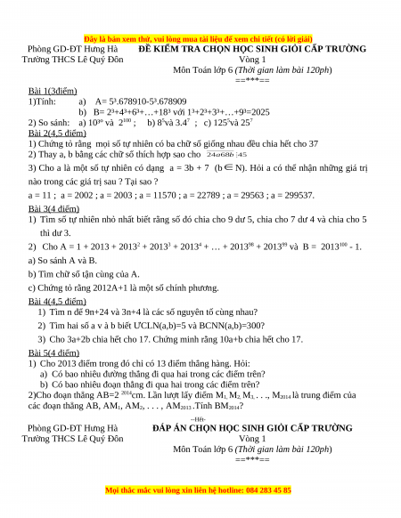 Đề thi chọn HSG cấp Trường môn Toán 6 năm 2022 - 2023 - THCS Lê Quý Đôn - V1 có đáp án