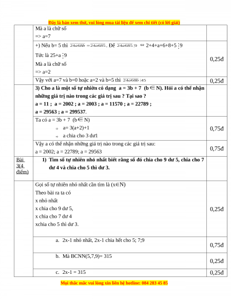 Mà a là chữ số => a=7 +) Nếu b= 5 thì . Để 2+4+a+6+8+5 9 Tức là 25+a 9 0,25đ Mà a là chữ số => a=2