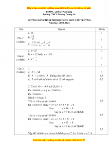 HƯỚNG DẪN CHẤM THI HỌC SINH GIỎI CẤP TRƯỜNG Năm học: 2022-2023 Câu Đáp án Điểm a) 55 1 Câu 1: b) 1 (3 điểm) c) 1 a) x= 25 1 b) x = 12 hoặc x = - 26 Câu 2: 1 (3 điểm) c) x = 1 Câu 3: 1) (5 điểm) a) A = - 50 1