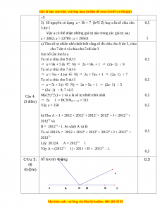 cho 7 dư 4 và chia cho 5 thì dư 3 Gọi số cần tìm là a Ta có a chia cho 9 dư 5 0,5 a = 9k + 5 (k N) 2a = 9k1 + 1 (2a- 1) 9 Ta có a chia cho 7 dư 4 a = 7m + 4 (m N) 2a = 7m1 + 1 (2a- 1) 7 Ta có a chia cho 5 dư 3 0,5 a = 5t + 3 (t N) 2a = 5t1 + 1 (2a- 1) 5 (2a- 1) 9; 7 và 5 Câu 4: