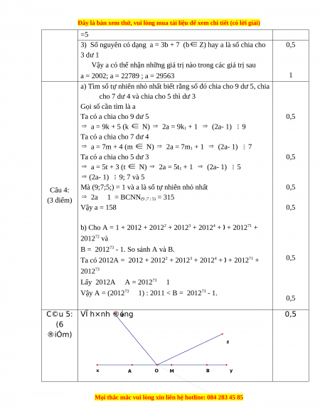Mà (9;7;5;) = 1 và a là số tự nhiên nhỏ nhất 0,5 (3 điểm) 2a 1 = BCNN(9 ;7 ; 5) = 315 Vậy a = 158 0,5