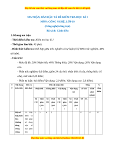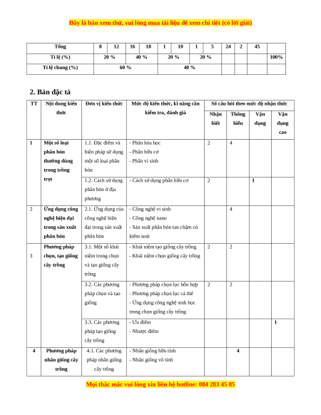 Tổng 8 12 16 18 1 10 1 5 24 2 45 Tỉ lệ (%) 20 % 40 % 20 % 20 % 100% Tỉ lệ chung (%) 60 % 40 % 2. Bản đặc tả TT Nội dung kiến