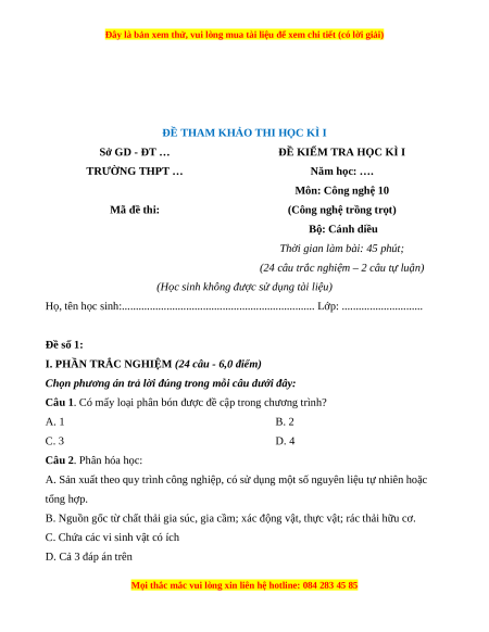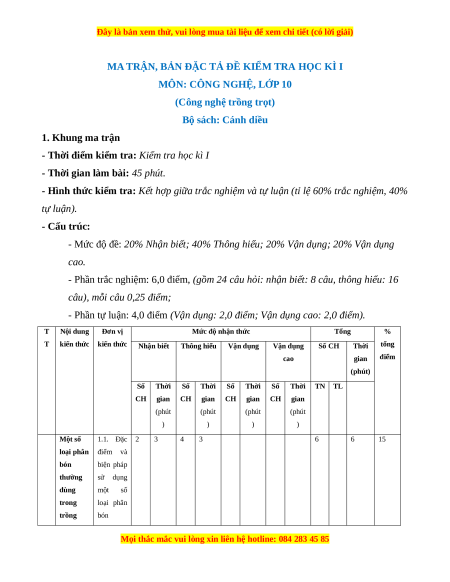 - Tailieugiaovien.com.vn giới thiệu bộ đề cuối kì 1 gồm đầy đủ ma trận và lời giải chi tiết môn Công ngệ trồng trọt 10 Cánh diều mới nhất năm 2023 - 2024 nhằm giúp Giáo viên có thêm tài liệu tham khảo ra đề thi Công nghệ lớp 10.