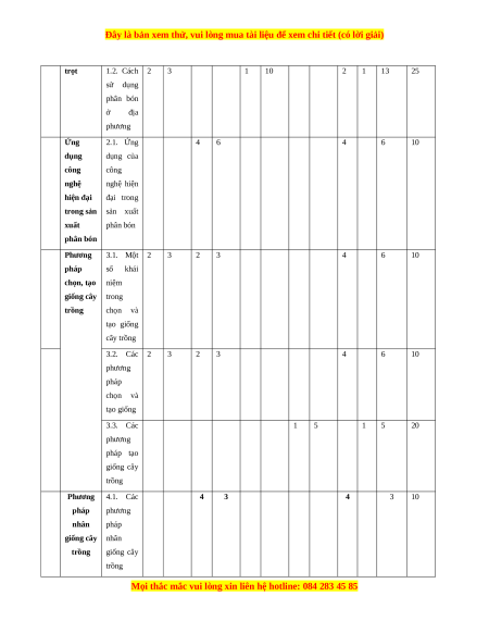 trong sản sản xuất xuất phân bón phân bón Phương 3.1. Một 2 3 2 3 4 6 10 pháp số khái chọn, tạo niệm giống cây trong trồng chọn và tạo giống cây trồng 3.2. Các 2 3 2 3 4 6 10 phương pháp chọn và tạo giống 3.3. Các 1 5 1 5 20 phương pháp tạo giống cây trồng Phương 4.1. Các 4 3 4 3 10 pháp phương nhân pháp giống cây nhân trồng giống cây trồng