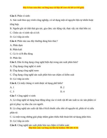 Câu 1. Có mấy loại phân bón được đề cập trong chương trình? A. 1 B. 2 C. 3 D. 4