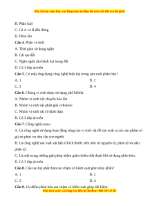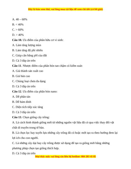 Câu 10. Ưu điểm của phân hữu cơ vi sinh: A. Làm tăng lượng mùn