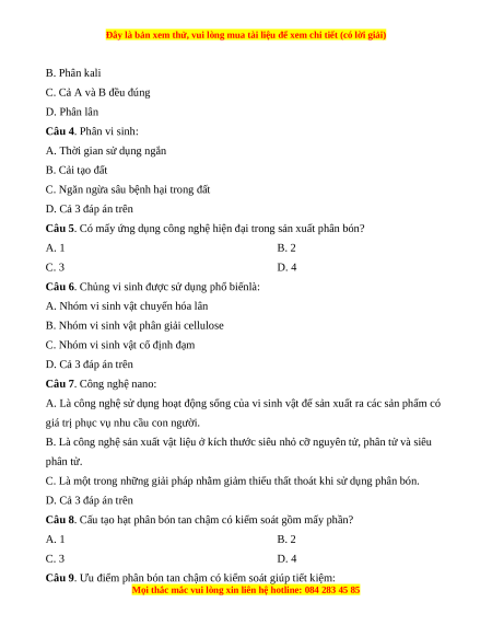 Câu 5. Có mấy ứng dụng công nghệ hiện đại trong sản xuất phân bón? A. 1 B. 2 C. 3 D. 4