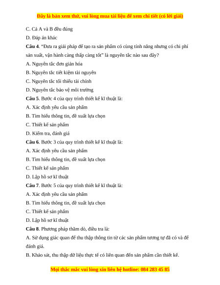 Câu 1. Thiết kế kĩ thuật có nguyên tắc nào sau đây? A. Nguyên tắc tối ưu