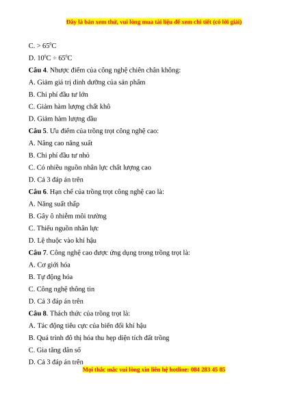 Câu 1. Công nghệ cao trong chế biến sản phẩm trồng trọt? A. Công nghệ sấy lạnh
