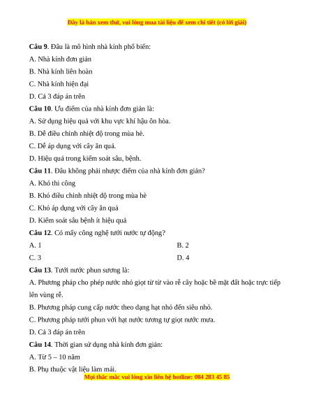 Câu 9. Đâu là mô hình nhà kính phổ biến: A. Nhà kính đơn giản B. Nhà kính liên hoàn C. Nhà kính hiện đại D. Cả 3 đáp án trên