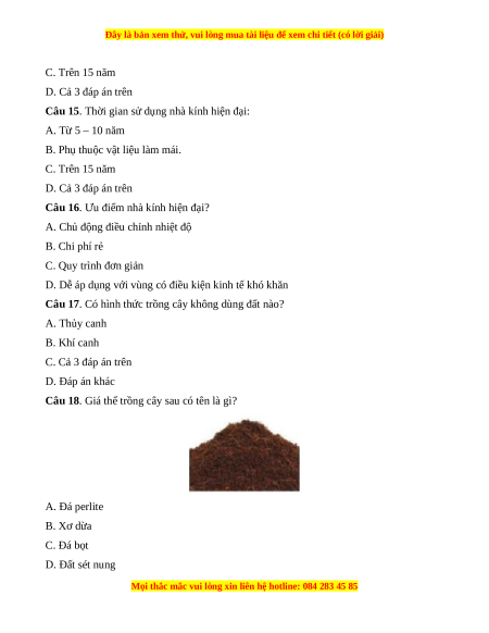 Câu 15. Thời gian sử dụng nhà kính hiện đại: A. Từ 5 – 10 năm