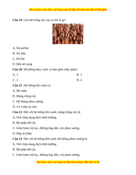 Câu 18. Giá thể trồng cây sau có tên là gì? A. Đá perlite B. Xơ dừa C. Đá bọt D. Đất sét nung