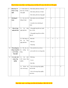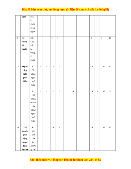 nghệ học, kĩ thuật, công nghệ 2 Hệ 2.1. 4 3 4 3 10 thống Cấu kĩ trúc thuật hệ thống kĩ thuật 3 Một số 3.1. 2 3 2 3 4 6 10 công Các nghệ công phổ nghệ biến phổ biến 3.2. 2 3 2 3 1 10 4 1 16 30 Nội dung cơ bản của công nghệ phổ biến 4 Thị 4.1. 4 6 4 6 10 trườn Yêu g lao cầu động của trong thị lĩnh trườn vực kĩ g lao