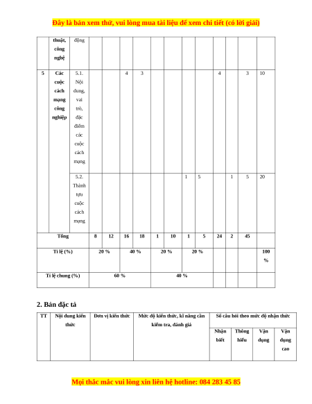 thuật, động công nghệ 5 Các 5.1. 4 3 4 3 10 cuộc Nội cách dung, mạng vai công trò, nghiệp đặc điểm các cuộc cách mạng 5.2. 1 5 1 5 20 Thành tựu cuộc cách mạng Tổng 8 12 16 18 1 10 1 5 24 2 45 Tỉ lệ (%) 20 % 40 % 20 % 20 % 100 % Tỉ lệ chung (%) 60 % 40 % 2. Bản đặc tả TT Nội dung kiến