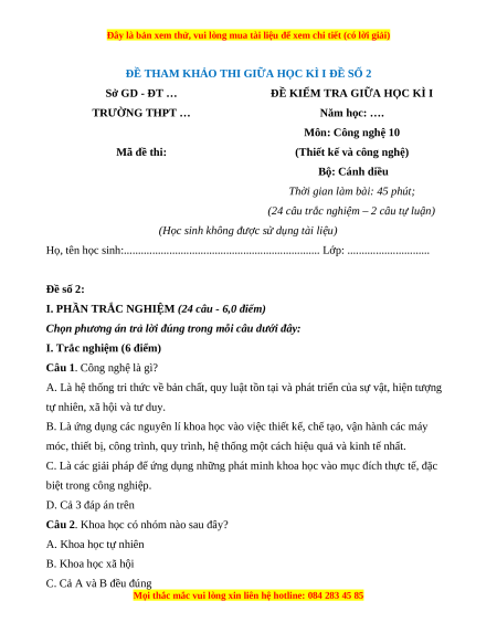 - Tailieugiaovien.com.vn giới thiệu bộ đề giữa kì 1 gồm đầy đủ ma trận và lời giải chi tiết môn Công ngệ Thiết kế 10 Cánh diều mới nhất năm 2023 - 2024 nhằm giúp Giáo viên có thêm tài liệu tham khảo ra đề thi Công nghệ lớp 10.