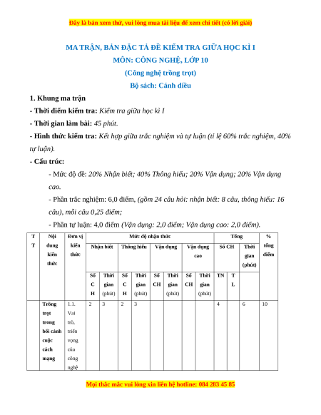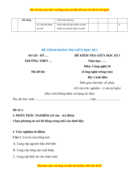 - Tailieugiaovien.com.vn giới thiệu bộ đề giữa kì 1 gồm đầy đủ ma trận và lời giải chi tiết môn Công ngệ trồng trọt 10 Cánh diều mới nhất năm 2023 - 2024 nhằm giúp Giáo viên có thêm tài liệu tham khảo ra đề thi Công nghệ lớp 10.