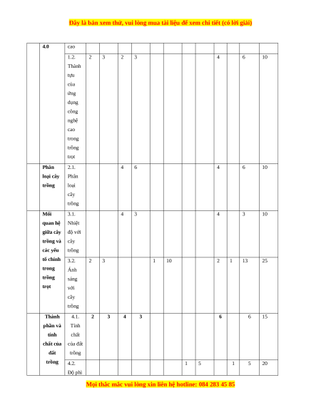 4.0 cao 1.2. 2 3 2 3 4 6 10 Thành tựu của ứng dụng công nghệ cao trong trồng trọt Phân 2.1. 4 6 4 6 10 loại cây Phân trồng loại cây trồng Mối 3.1. 4 3 4 3 10 quan hệ Nhiệt