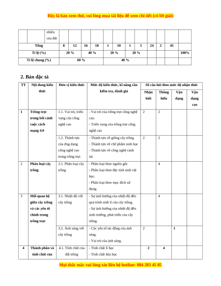 Mức độ nhận thức Tổng % T dung kiến tổng Nhận biết Thông hiểu Vận dụng Vận dụng Số CH Thời kiến thức điểm cao gian thức (phút) Số Thời Số Thời Số Thời Số Thời TN T C gian C gian CH gian CH gian L H (phút) H (phút) (phút) (phút) Trồng 1.1. 2 3 2 3 4 6 10 trọt Vai trong trò, bối cảnh triển cuộc vọng cách của mạng công nghệ