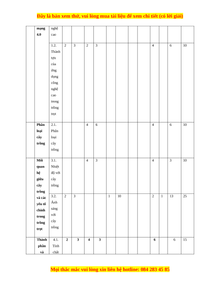mạng nghệ 4.0 cao 1.2. 2 3 2 3 4 6 10 Thành tựu của ứng dụng công nghệ cao trong trồng trọt Phân 2.1. 4 6 4 6 10 loại Phân cây loại trồng cây trồng Mối 3.1. 4 3 4 3 10 quan Nhiệt hệ độ với giữa cây cây trồng trồng và các 3.2. 2 3 1 10 2 1 13 25 yếu tố Ánh chính sáng trong với trồng cây trọt trồng Thành 4.1. 2 3 4 3 6 6 15 phần Tính và chất