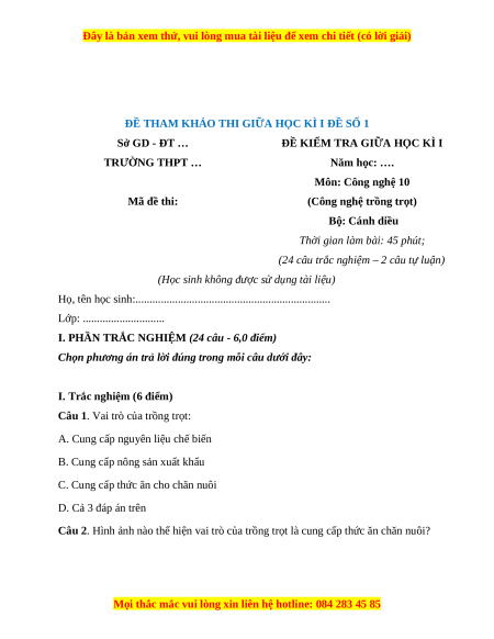 - Tailieugiaovien.com.vn giới thiệu bộ đề giữa kì 1 gồm đầy đủ ma trận và lời giải chi tiết môn Công ngệ trồng trọt 10 Cánh diều mới nhất năm 2023 - 2024 nhằm giúp Giáo viên có thêm tài liệu tham khảo ra đề thi Công nghệ lớp 10.