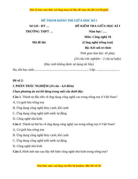ĐỀ KIỂM TRA GIỮA HỌC KÌ I TRƯỜNG THPT … Năm học: …. Môn: Công nghệ 10 Mã đề thi: