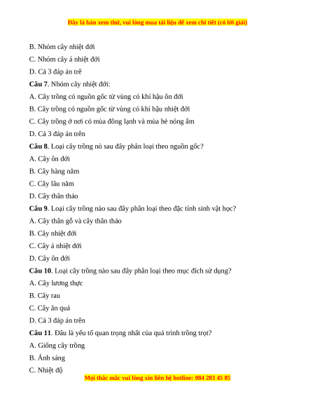 Câu 8. Loại cây trồng nò sau đây phân loại theo nguồn gốc? A. Cây ôn đới B. Cây hàng năm C. Cây lâu năm D. Cây thân thảo