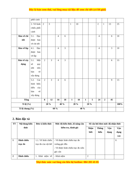 Bản vẽ xây 5.1. Một 2 3 4 3 6 6 15 dựng số quy ước trên bản vẽ xây dựng 5.2. Các 2 3 4 6 6 9 15 hình biểu diễn của bản vẽ xây dựng Tổng 8 12 16 18 1 10 1 5 24 2 45 Tỉ lệ (%) 20 % 40 % 20 % 20 % 100% Tỉ lệ chung (%) 60 % 40 % 2. Bản đặc tả TT Nội dung kiến