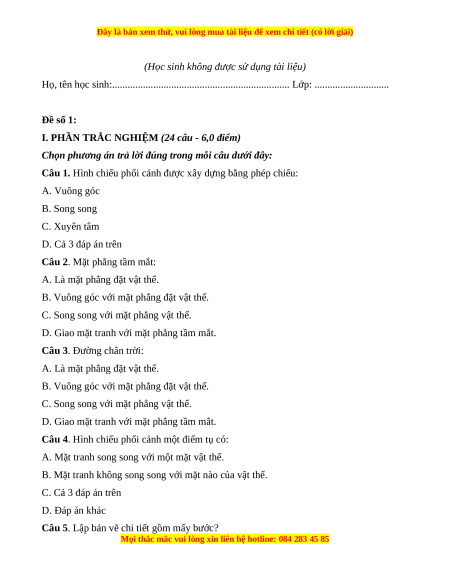 Câu 1. Hình chiếu phối cảnh được xây dựng bằng phép chiếu: A. Vuông góc B. Song song C. Xuyên tâm D. Cả 3 đáp án trên