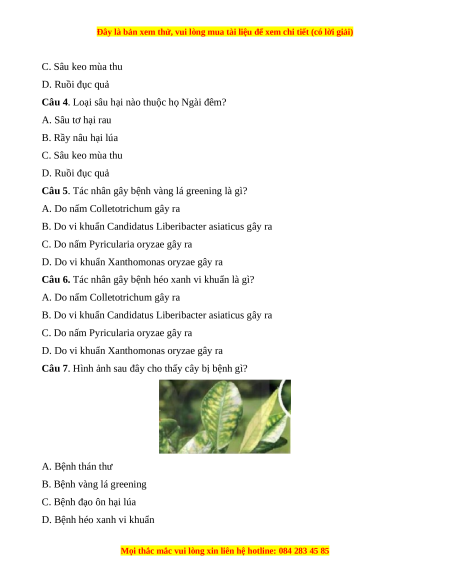 Câu 7. Hình ảnh sau đây cho thấy cây bị bệnh gì? A. Bệnh thán thư B. Bệnh vàng lá greening