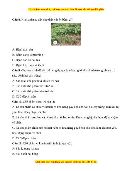 Câu 9. Chương trình đề cập đến ứng dụng của công nghệ vi sinh nào trong phòng trừ