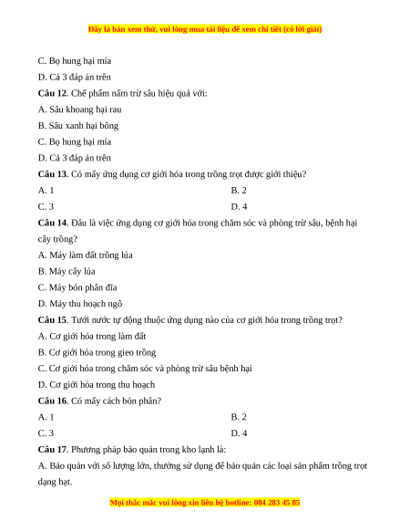 Câu 13. Có mấy ứng dụng cơ giới hóa trong trồng trọt được giới thiệu? A. 1 B. 2 C. 3 D. 4