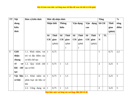 tính chất cơ bản của vật liệu cơ khí thông dụng, vật liệu mới 2.3. Nhận biết tính 1 0,75 1 0,75 2,5 chất của vật liệu cơ khí 3 Các 3.1. Khái niệm, phân 1 0,75 1 1,5 2 3,25 5