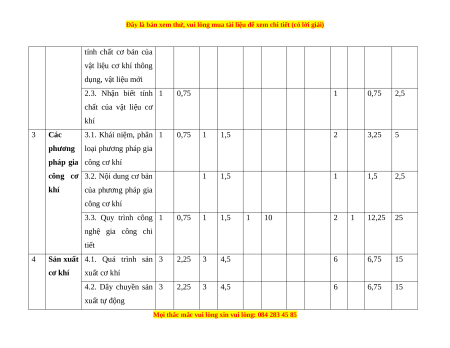 Sản xuất 4.1. Quá trình sản 3 2,25 3 4,5 6 6,75 15 cơ khí xuất cơ khí 4.2. Dây chuyền sản 3 2,25 3 4,5 6 6,75 15 xuất tự động