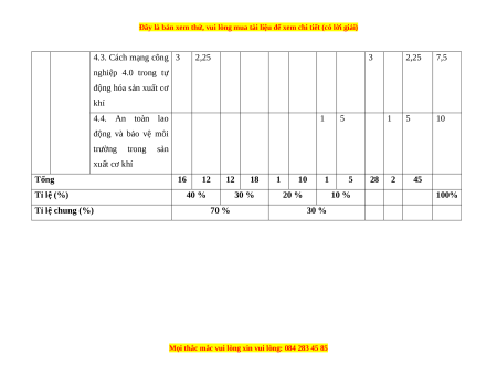 4.3. Cách mạng công 3 2,25 3 2,25 7,5 nghiệp 4.0 trong tự động hóa sản xuất cơ khí 4.4. An toàn lao 1 5 1 5 10 động và bảo vệ môi trường trong sản xuất cơ khí Tổng 16 12 12 18 1 10 1 5 28 2 45 Tỉ lệ (%) 40 % 30 % 20 % 10 % 100% Tỉ lệ chung (%) 70 % 30 %