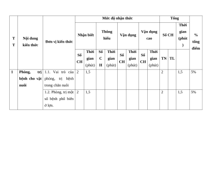 bệnh cho vật phòng, trị bệnh nuôi trong chăn nuôi 1.2. Phòng, trị một 2 1,5 2 1,5 5% số bệnh phổ biến ở lợn. 1.3. Phòng, trị một 2 1,5 2 1,5 5% số bệnh phổ biến ở gia cầm. 1.4. Phòng, trị một 2 1,5 2 1,5 5% số bệnh phổ biến ở trâu, bò. 1.5. Ứng dụng 1 0,75 1 0,75 2,5% công nghệ sinh học trong phòng, trị bệnh cho vật nuôi. 2