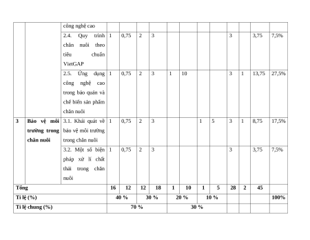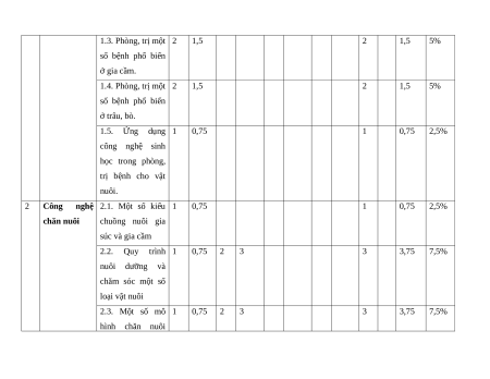 Công nghệ 2.1. Một số kiểu 1 0,75 1 0,75 2,5% chăn nuôi chuồng nuôi gia súc và gia cầm 2.2. Quy trình 1 0,75 2 3 3 3,75 7,5% nuôi dưỡng và chăm sóc một số loại vật nuôi 2.3. Một số mô 1 0,75 2 3 3 3,75 7,5% hình chăn nuôi công nghệ cao 2.4. Quy trình 1 0,75 2 3 3 3,75 7,5% chăn nuôi theo tiêu chuẩn VietGAP 2.5. Ứng dụng 1 0,75 2 3 1 10 3 1 13,75 27,5% công nghệ cao trong bảo quản và chế biến sản phẩm chăn nuôi 3