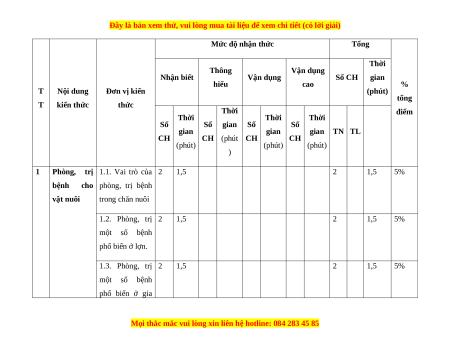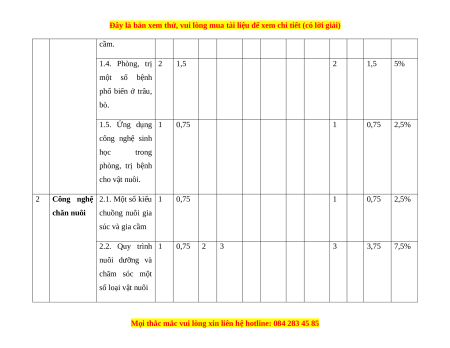 cầm. 1.4. Phòng, trị 2 1,5 2 1,5 5% một số bệnh phổ biến ở trâu, bò. 1.5. Ứng dụng 1 0,75 1 0,75 2,5% công nghệ sinh học trong phòng, trị bệnh cho vật nuôi. 2