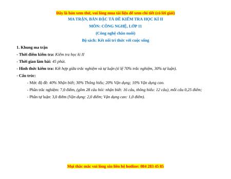 - Tailieugiaovien.com.vn giới thiệu bộ đề cuối kì 1 gồm đầy đủ ma trận và lời giải chi tiết môn Công nghệ chăn nuôi 11 Kết nối tri thức mới nhất nhằm giúp Giáo viên có thêm tài liệu tham khảo ra đề thi Công nghệ lớp 11.
