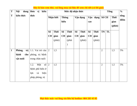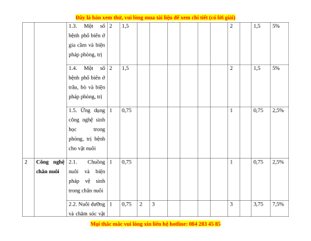 1.3. Một số 2 1,5 2 1,5 5% bệnh phổ biến ở gia cầm và biện pháp phòng, trị 1.4. Một số 2 1,5 2 1,5 5% bệnh phổ biến ở trâu, bò và biện pháp phòng, trị 1.5. Ứng dụng 1 0,75 1 0,75 2,5% công nghệ sinh học trong phòng, trị bệnh cho vật nuôi 2