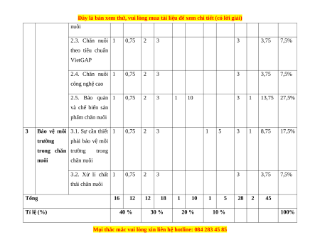 Công nghệ 2.1. Chuồng 1 0,75 1 0,75 2,5% chăn nuôi nuôi và biện pháp vệ sinh trong chăn nuôi 2.2. Nuôi dưỡng 1 0,75 2 3 3 3,75 7,5% và chăm sóc vật
