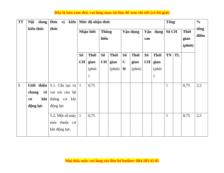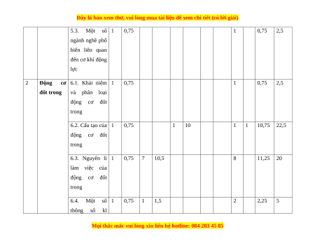 Động cơ 6.1. Khái niệm 1 0,75 1 0,75 2,5 đốt trong và phân loại động cơ đốt trong 6.2. Cấu tạo của 1 0,75 1 10 1 1 10,75 22,5 động cơ đốt trong 6.3. Nguyên lí 1 0,75 7 10,5 8 11,25 20 làm việc của động cơ đốt trong 6.4. Một số 1 0,75 1 1,5 2 2,25 5 thông số kĩ