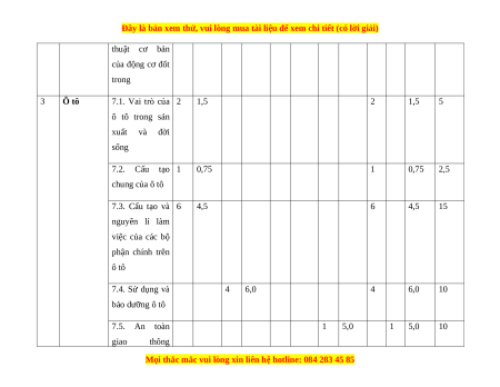 thuật cơ bản của động cơ đốt trong 3 Ô tô 7.1. Vai trò của 2 1,5 2 1,5 5 ô tô trong sản xuất và đời sống 7.2. Cấu tạo 1 0,75 1 0,75 2,5 chung của ô tô 7.3. Cấu tạo và 6 4,5 6 4,5 15 nguyên lí làm việc của các bộ phận chính trên ô tô 7.4. Sử dụng và 4 6,0 4 6,0 10 bảo dưỡng ô tô 7.5. An toàn 1 5,0 1 5,0 10 giao thông